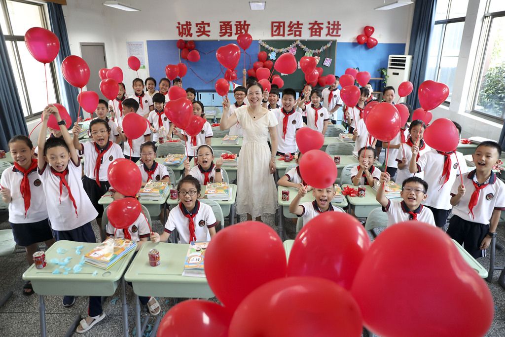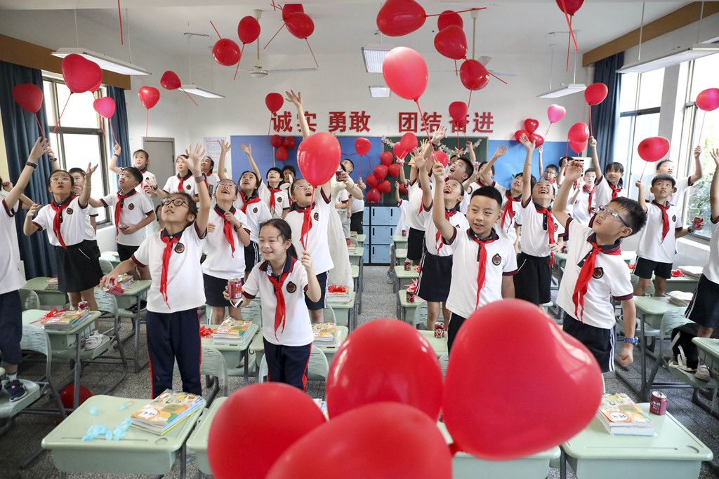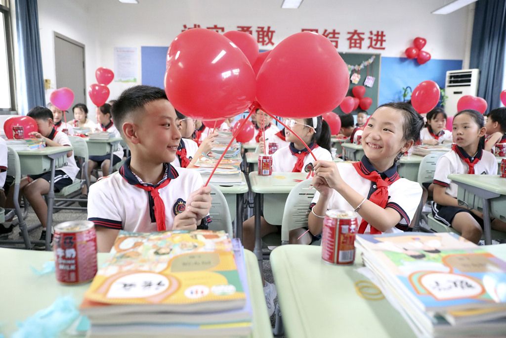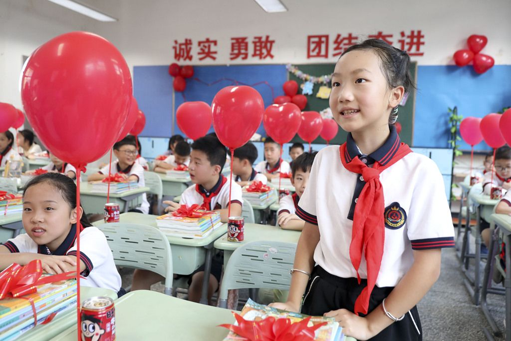 2024年9月1日,浙江省杭州市桐庐县城南小学,学生在展示红色气球。