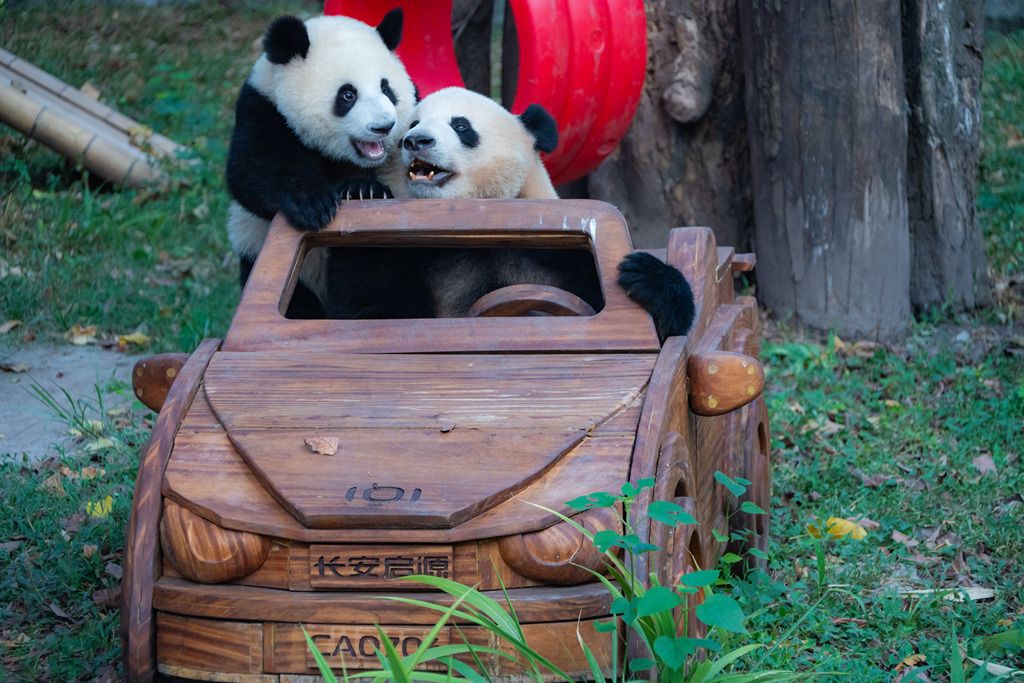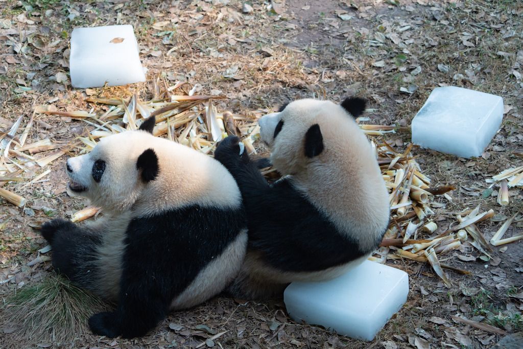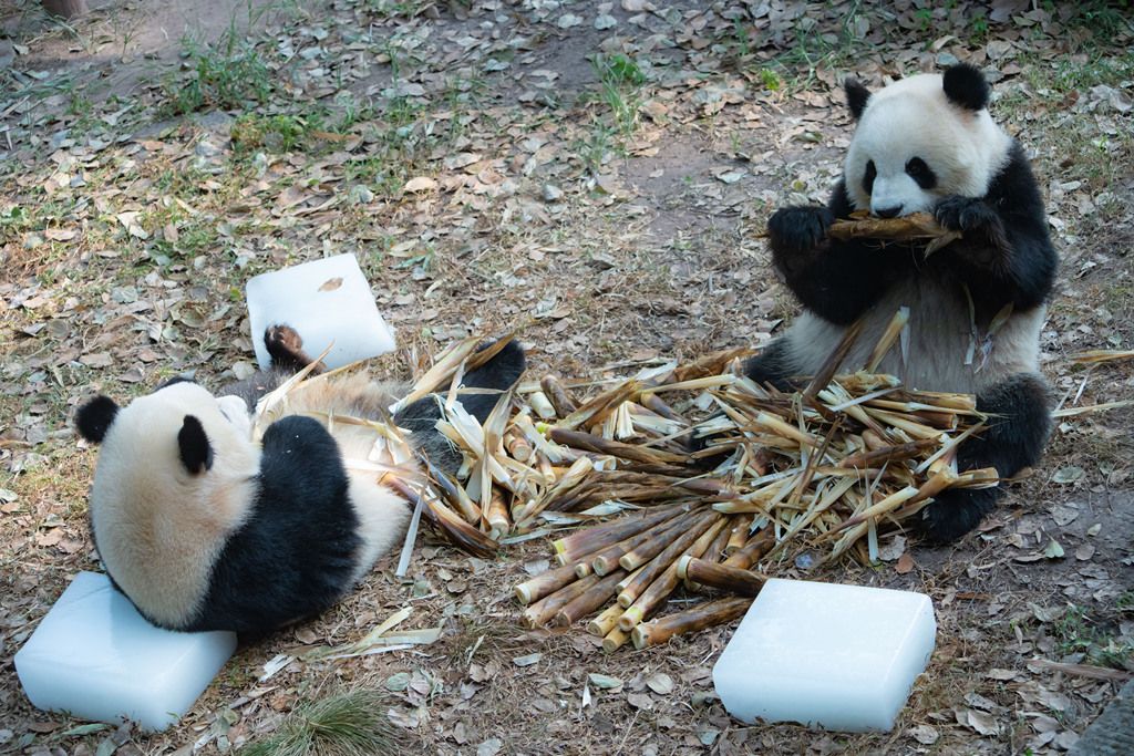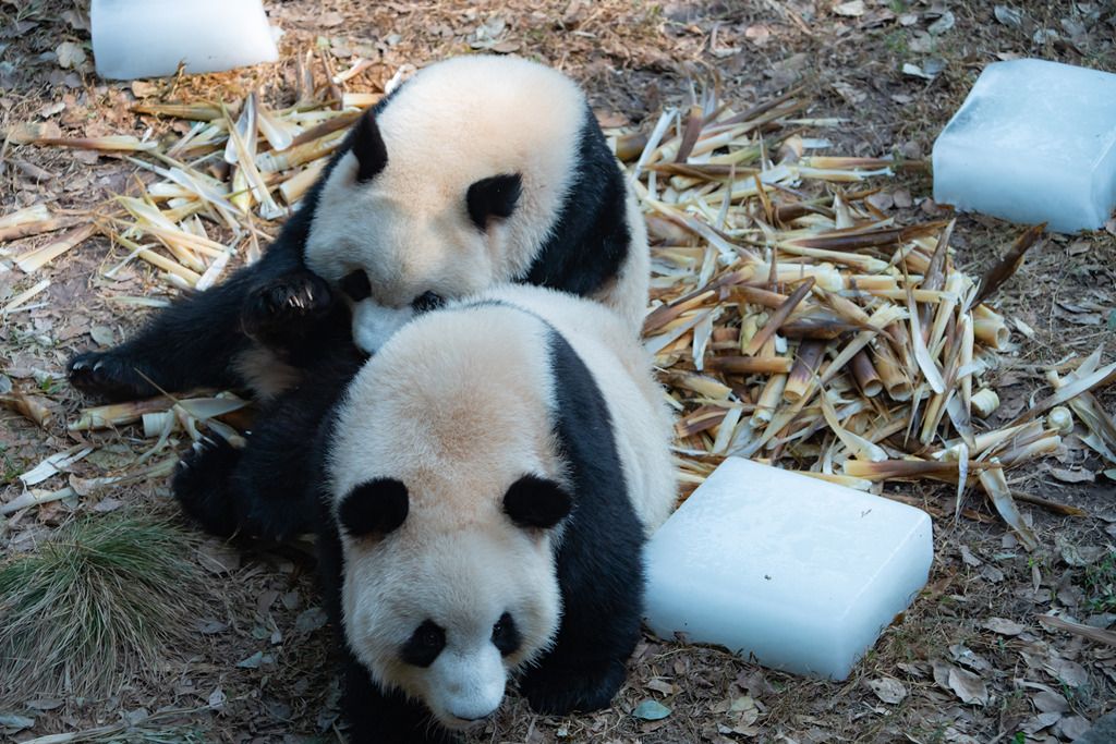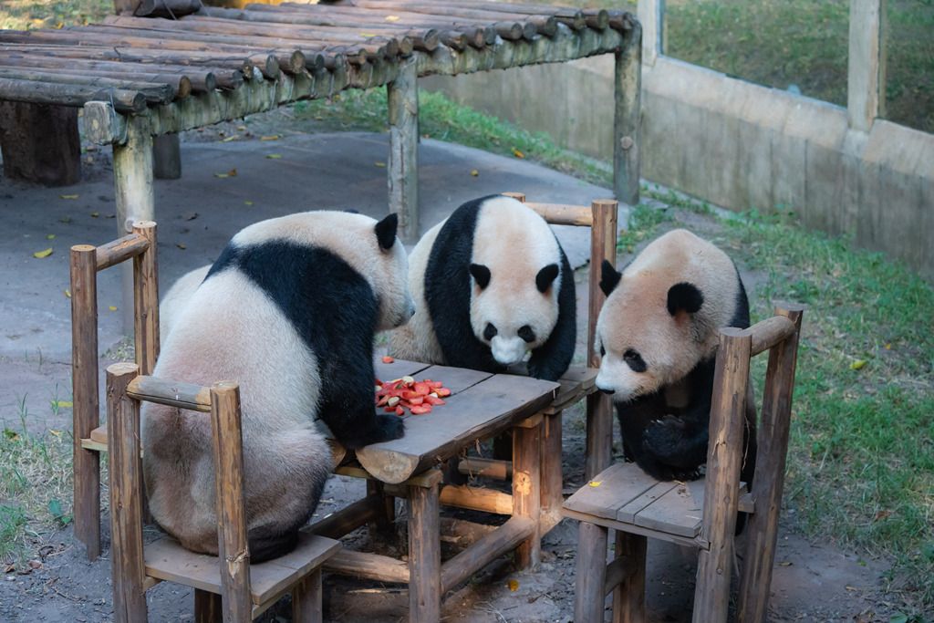 2024年9月1日,重庆持续40℃高温天气,动物园内,大熊猫“四喜丸子”围桌聚餐。