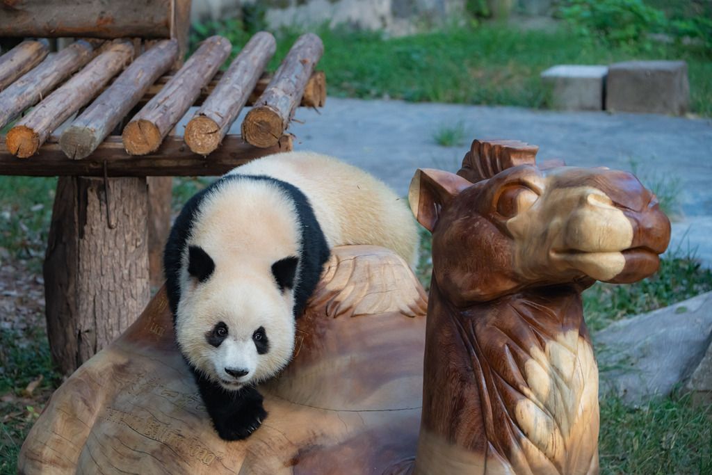 2024年9月1日,重庆持续40℃高温天气,动物园内,大熊猫“渝爱”在骑木制骆驼。