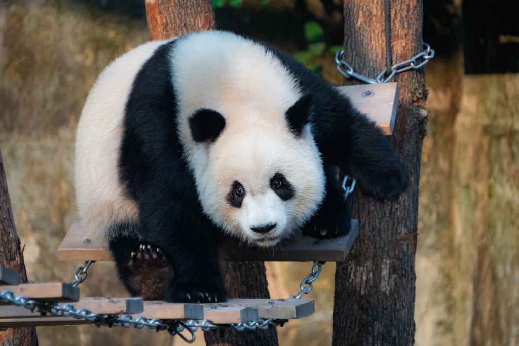 2024年9月1日,重庆持续40℃高温天气,动物园内,大熊猫“渝爱”在玩浮桥。