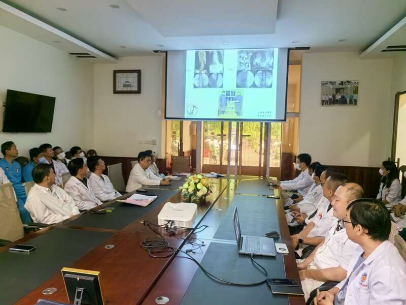 为帮助柬埔寨建立脊柱侧弯治疗体系,提升脊柱侧弯诊疗能力,军医组对王家军总医院的脊柱外科医生进行了脊柱侧弯理论知识的系统授课培训,并建立了柬埔寨脊柱侧弯序贯诊疗的流程。