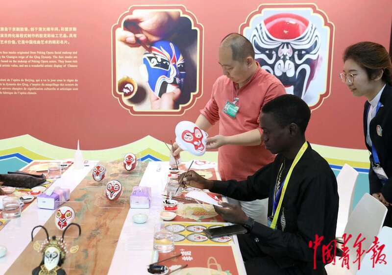 9月2日,北京,2024年中非合作论坛峰会新闻中心的非遗互动展示区,来自多哥的记者阿布拉(中)戴上自己绘制的孙悟空脸谱与工作人员互动。中青报·中青网记者 陈剑/摄