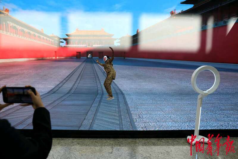 9月2日,北京,2024年中非合作论坛峰会新闻中心,CAVE 8K超高清沉浸式体验区,来自多哥的记者阿布拉戴着自己在彩塑京剧脸谱体验台绘制的孙悟空脸谱,在北京故宫的高清视频墙前翩翩起舞。中青报·中青网记者 陈剑/摄