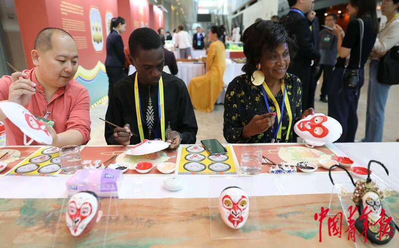 9月4日,北京,2024年中非合作论坛峰会新闻中心非遗互动展示区,来自尼日尔萨赫勒报业集团的伊斯马尔(中)正在绘制孙悟空脸谱。中青报·中青网记者 陈剑/摄