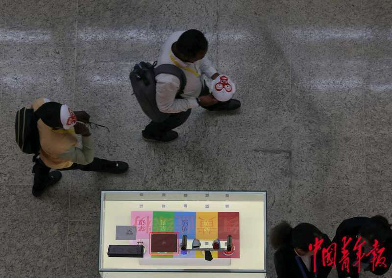 9月2日,北京,2024年中非合作论坛峰会新闻中心,来自非洲的记者朋友边走边欣赏手中的孙悟空脸谱,经过一处非遗展示台。中青报·中青网记者 陈剑/摄