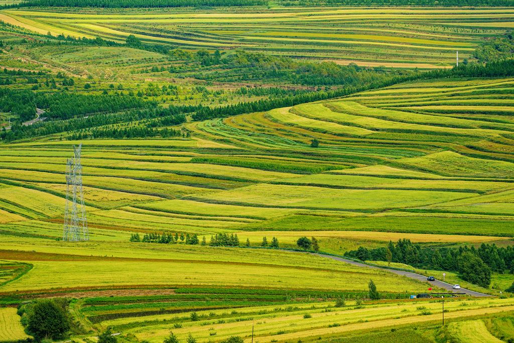 2024年8月28日,河北省张家口,草原天路沿途五彩缤纷的梯田。