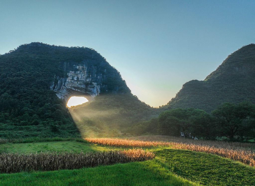 2024年8月27日,湖南永州,道县月岩风景区清晨现光束穿洞景观,蔚为壮观。