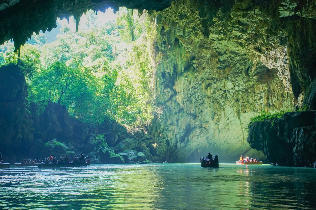 2024年8月27日,游客在广西河池市巴马瑶族自治县乘舟游览百鸟岩。百鸟岩又名水波天窗,“天窗”是岩溶洞穴洞壁或者天篷上因溶蚀、坍陷而漏出的窗式天然框景景观。 中新社记者 陈冠言 摄
