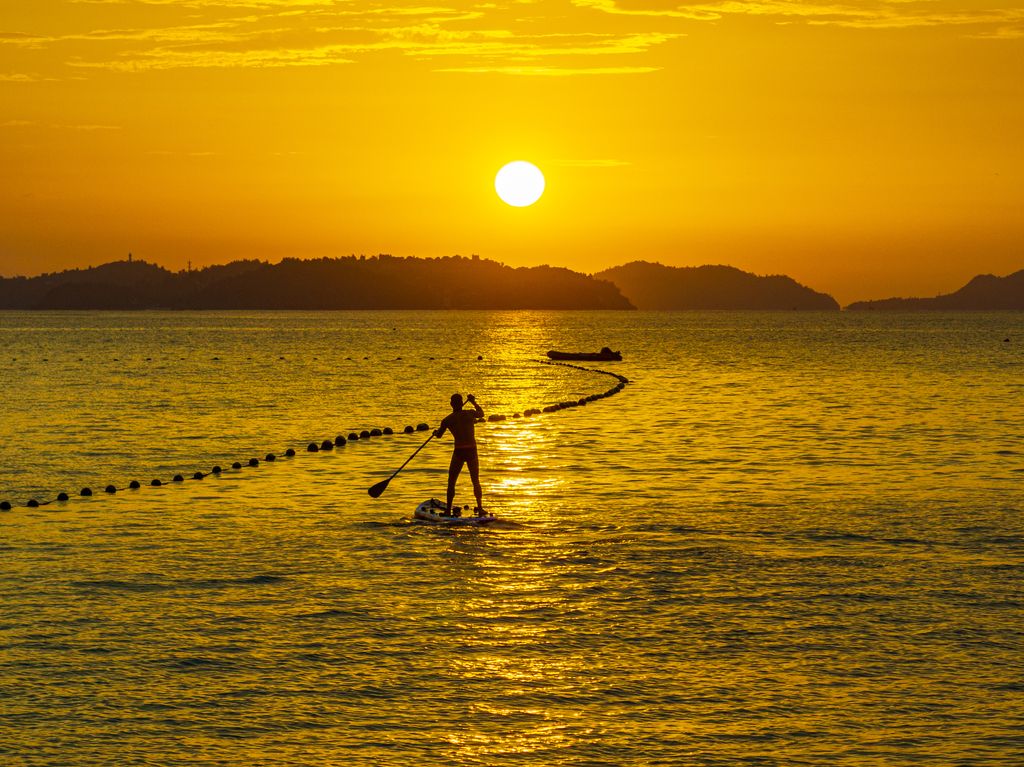 2024年8月30日,浙江省台州市玉环市坎门街道后沙滩,朝霞映照下的海岸线如诗如画,游人驻足观赏日出,更有划桨板的爱好者们轻拨水面,与绚丽的晨光交织出一幅动人的画面,完美融合了自然之美与健康生活的浪漫情调。