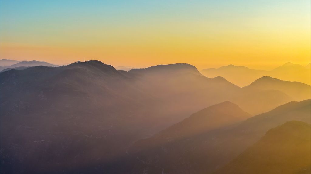 2024年8月25日,福建省宁德市霞浦县北岐村,日出时分,金色光芒洒满群山,云雾缭绕山谷间,山峦如画。