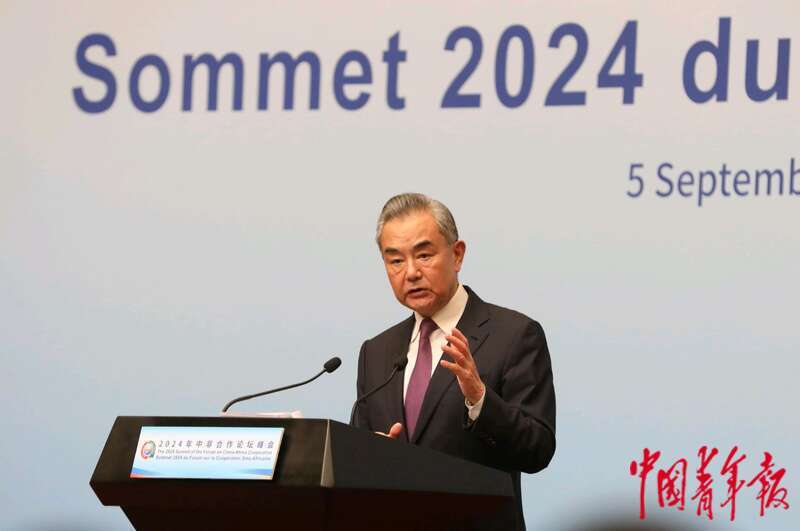 9月5日晚,北京,国家会议中心,中共中央政治局委员、中央外事工作委员会办公室主任、外交部长王毅(中)同塞内加尔外长法勒(左)、刚果(布)外长加科索(右)共同会见中外记者,全面介绍2024年中非合作论坛峰会成果。中青报·中青网记者 陈剑/摄