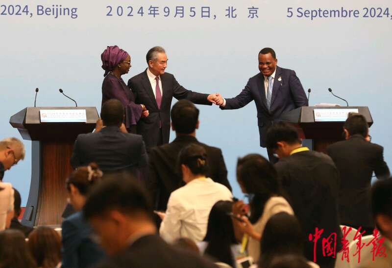 9月5日晚,北京,国家会议中心,中共中央政治局委员、中央外事工作委员会办公室主任、外交部长王毅(中)同塞内加尔外长法勒(左)、刚果(布)外长加科索(右)共同会见中外记者,全面介绍2024年中非合作论坛峰会成果。记者会结束后,王毅外长拉着另外两位外长的手,一起合影留念。中青报·中青网记者 陈剑/摄