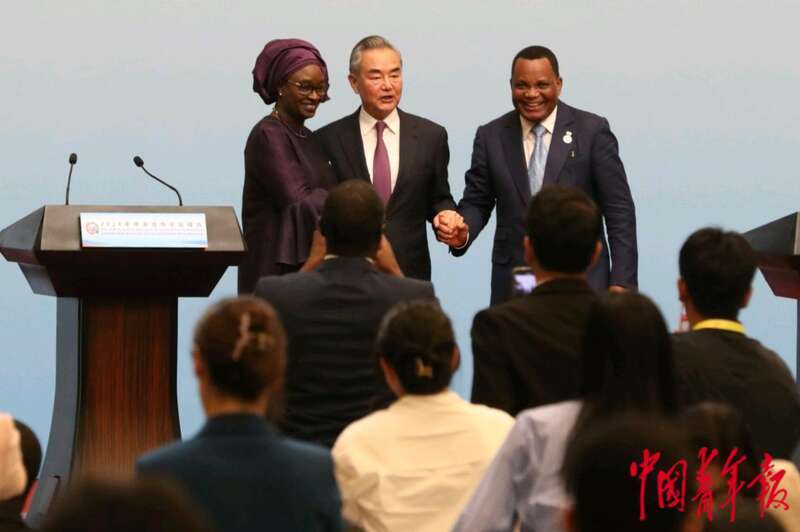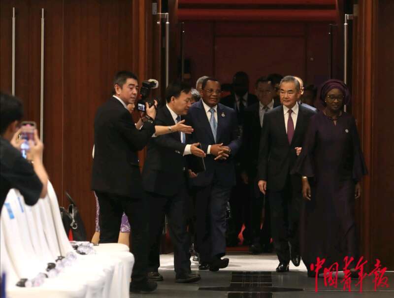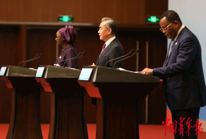 9月5日晚,北京,国家会议中心,中共中央政治局委员、中央外事工作委员会办公室主任、外交部长王毅(右二)同塞内加尔外长法勒(右一)、刚果(布)外长加科索(右三)步入会场,准备共同会见中外记者。中青报·中青网记者 陈剑/摄