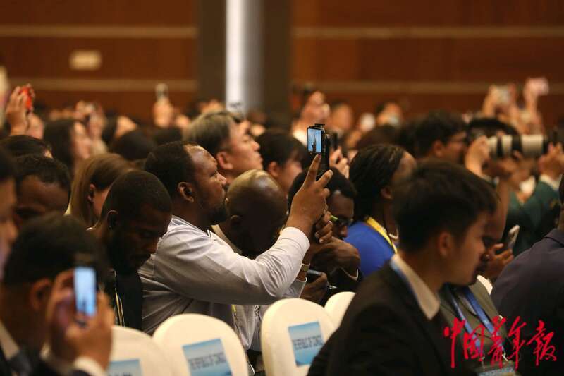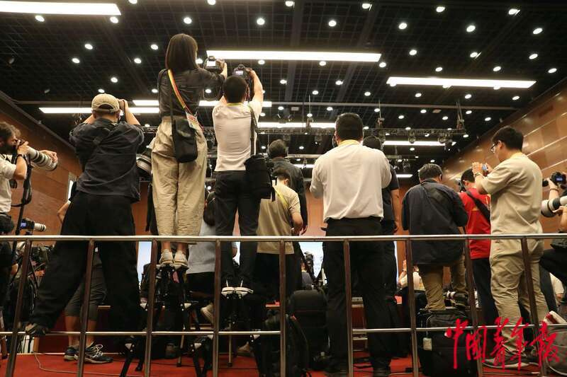 9月5日晚,北京,国家会议中心,参加记者见面会的中外记者在拍照。中青报·中青网记者 陈剑/摄