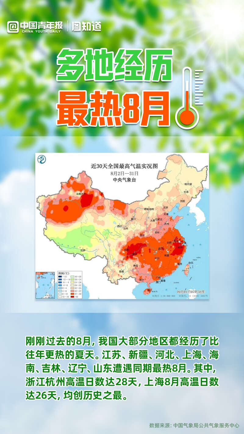 刚刚过去的8月,我国大部分地区都经历了比往年更热的夏天,江苏、新疆、河北、上海、海南、吉林、辽宁、山东遭遇同期最热8月,杭州、上海8月高温日数创历史之最。你在的城市,是否也经历了酷热8月?