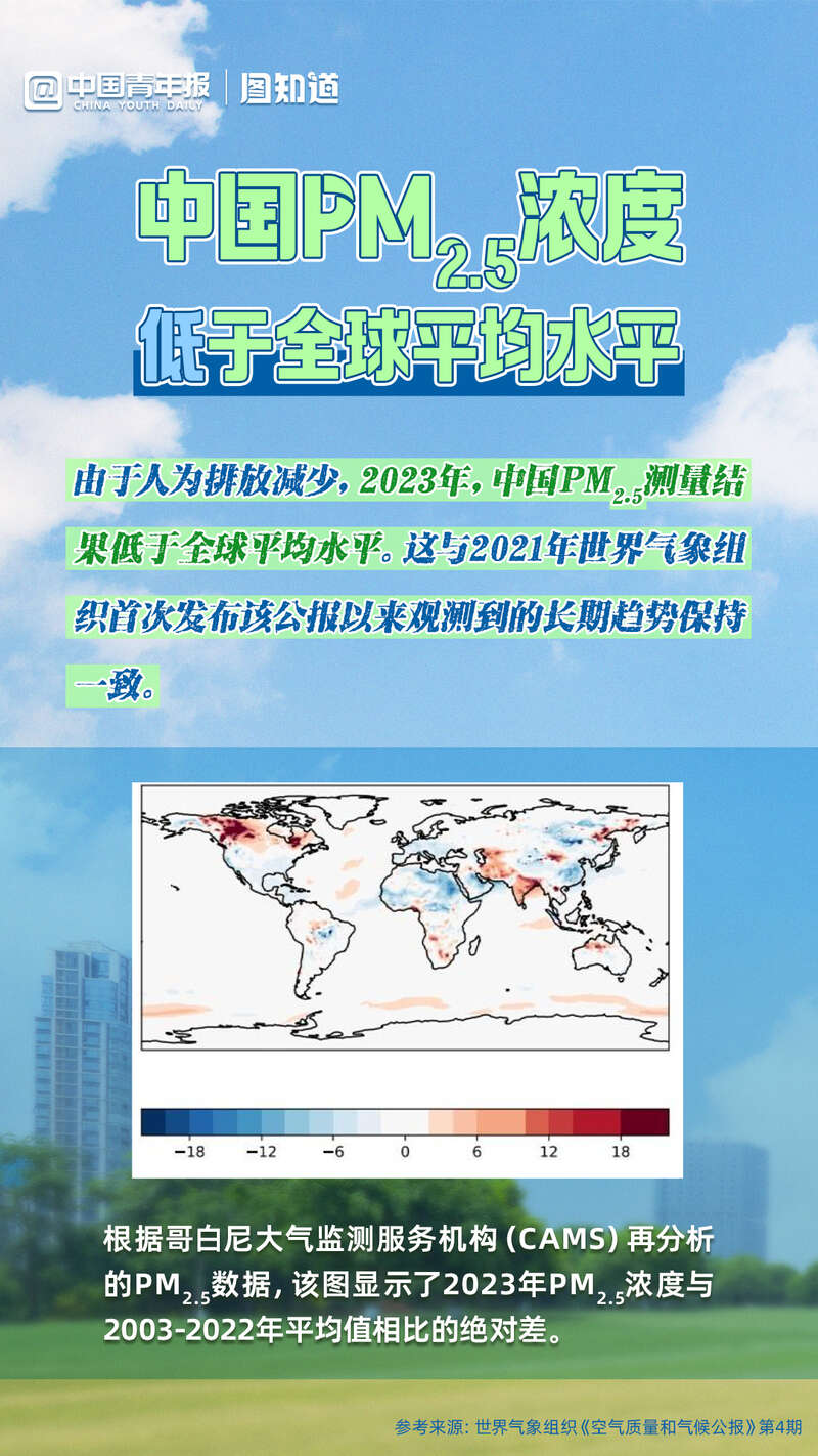 当地时间9月5日,世界气象组织发布最新《空气质量和气候公报》,公报显示,2023年,中国PM2.5测量结果低于全球平均水平。此前,《2023中国生态环境状况公报》显示,2023年我国339个地级及以上城市PM2.5平均浓度为30微克/立方米,好于年度目标近3微克/立方米,环境空气质量保持长期向好态势。