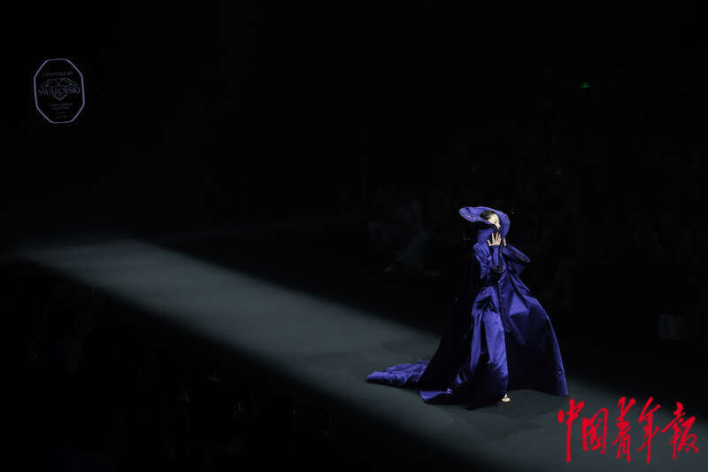 9月5日下午,北京751艺术区中央大厅,“施华洛世奇元素流行趋势发布”活动现场,模特身上的水晶元素,在现场灯光的照耀下闪着光芒,贴合此次走秀该品牌“循光之旅,绽耀璀璨”的主题。整个系列的展示中,设计师将传统非遗绒花技艺与施华洛世奇的璀璨元素融合,共使用了10500片绒花,镶嵌在每一套服装之中。王藜静/摄