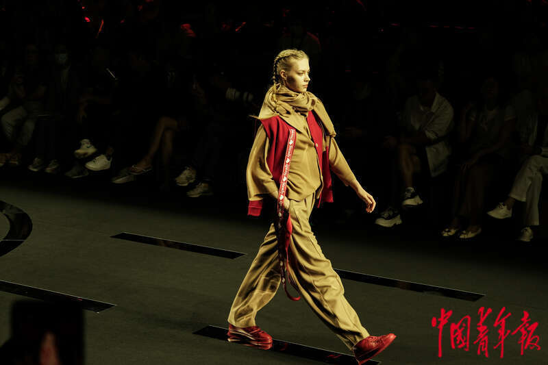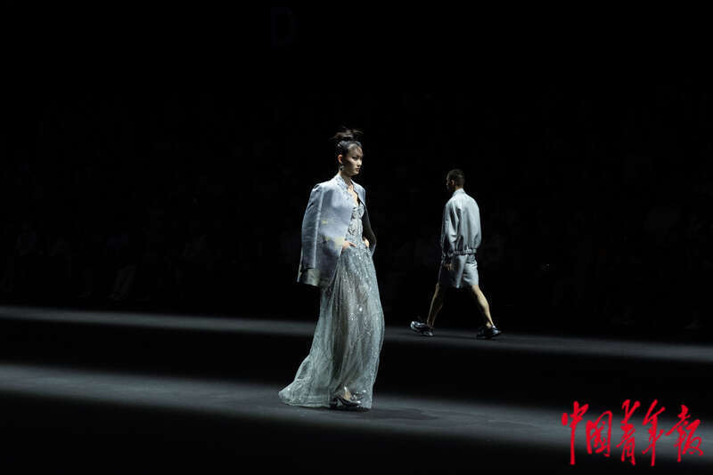 9月5日下午,北京751艺术区第一车间97罐,中国品牌“上久楷”的秀场中,两名模特展示服装。据介绍,本季秀场,上久楷延续了对宋锦工艺的传承,运用新材料、新科技,结合宋锦的特点,通过对传统宋锦纹样的重新解构与优化,创造出别具一格的国风图案,将传统文化与现代设计相融合。