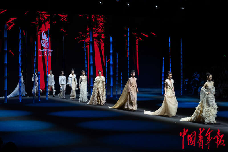 9月5日下午,北京751艺术区第一车间97罐,中国品牌“上久楷”的秀场中,模特穿过一片竹林布景,依次走到舞台中央。王藜静/摄