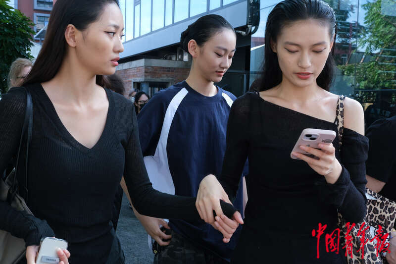 9月5日下午,北京751艺术区第一车间附近,几名刚走完秀的模特换上自己的衣服,牵着手赶向下一个秀场。王藜静/摄