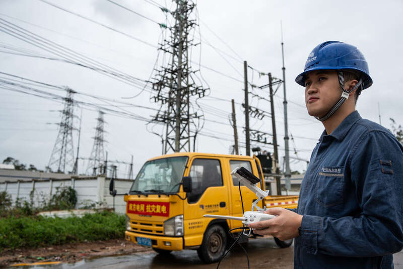 “6号电杆倾斜、7号横担变形、8号避雷器受损……”9月7日清晨,南方电网广东肇庆供电局支援海南的无人机飞手们迎着风雨开始勘察10千伏线路受损情况。“雨太密,风太大,飞行太困难了。”飞手霍文盛一边操作无人机,一边评估着天气情况。同伴为霍文盛加油打气,“尽可能保持机身平稳,我们多飞一段,指挥中心就多掌握一点情况。”临近中午,他们仔细勘察完每一处受灾点,随即奔赴下一条线路现场。同一时间,湛江廉江供电局抗灾复电党员突击队在勘灾时发现,廉江市吉水镇有一块巨幅广告幕布缠绕在10千伏线路上。现场仍刮着大风,广告幕布漂浮不定,给清障带来了不小的难度。“再不处理,迟早会停电的。”突击队员吴成嘉说,他们决定利用激光清障仪和无人机协同作战,一人操作无人机,带着挂钩飞向幕布,尽可能将幕布固定,另外一人使用激光清障仪开展清障。最后,他们抓住停雨间隙,成功处理了隐患。
