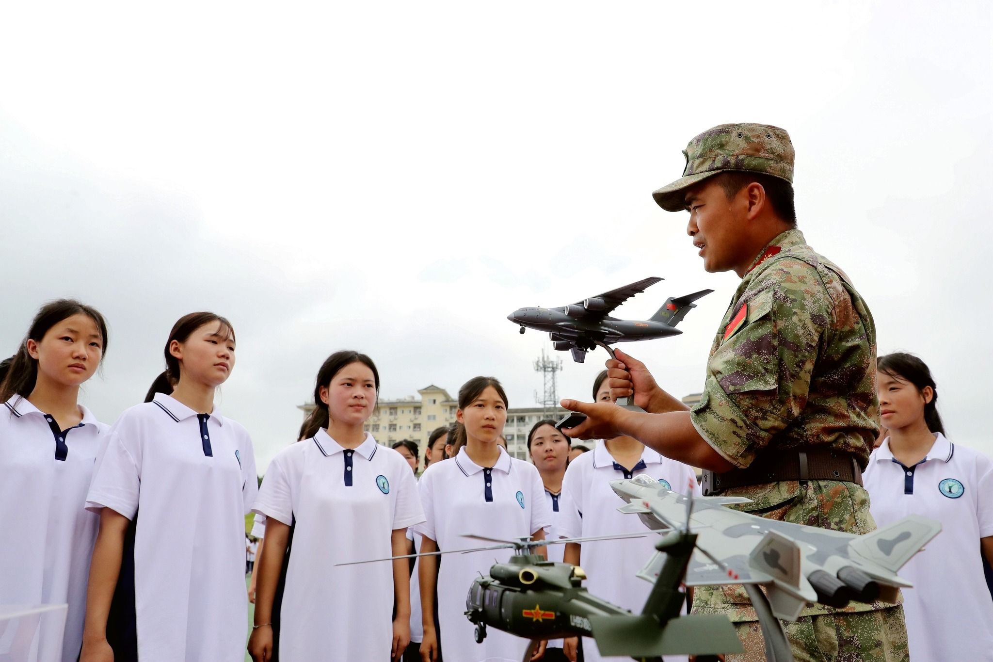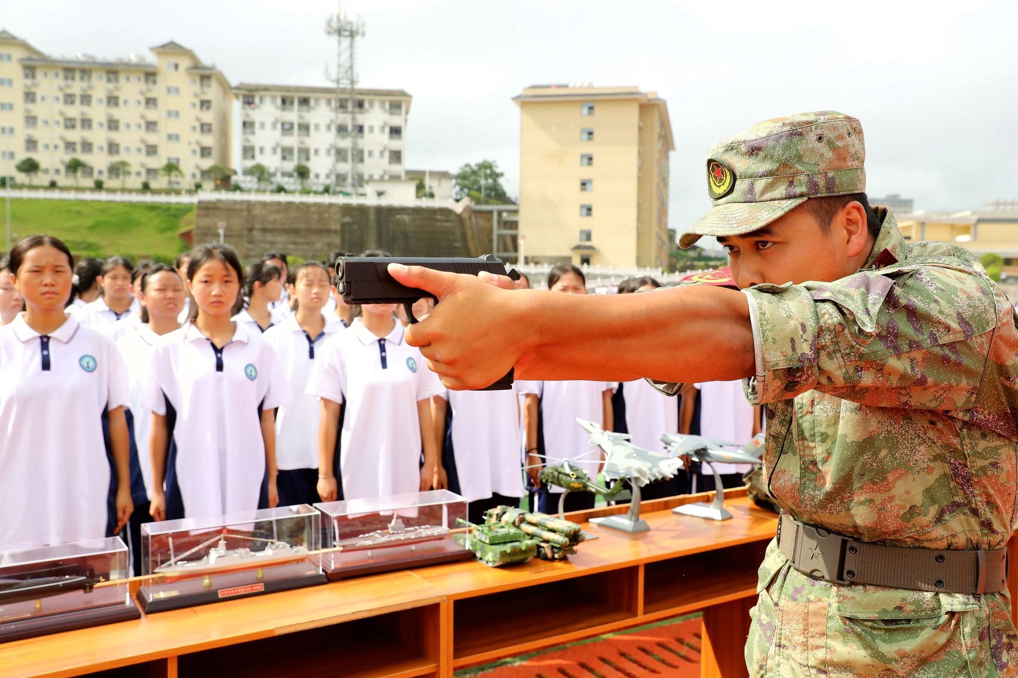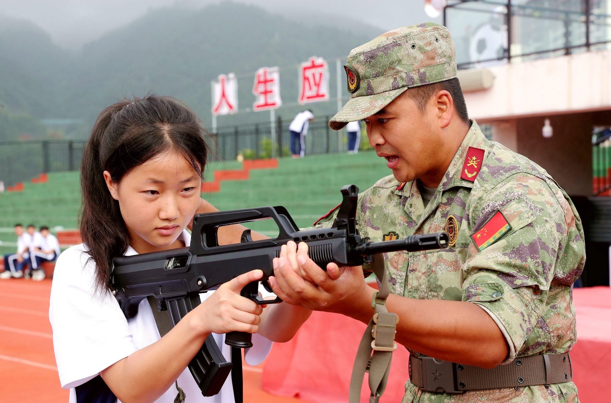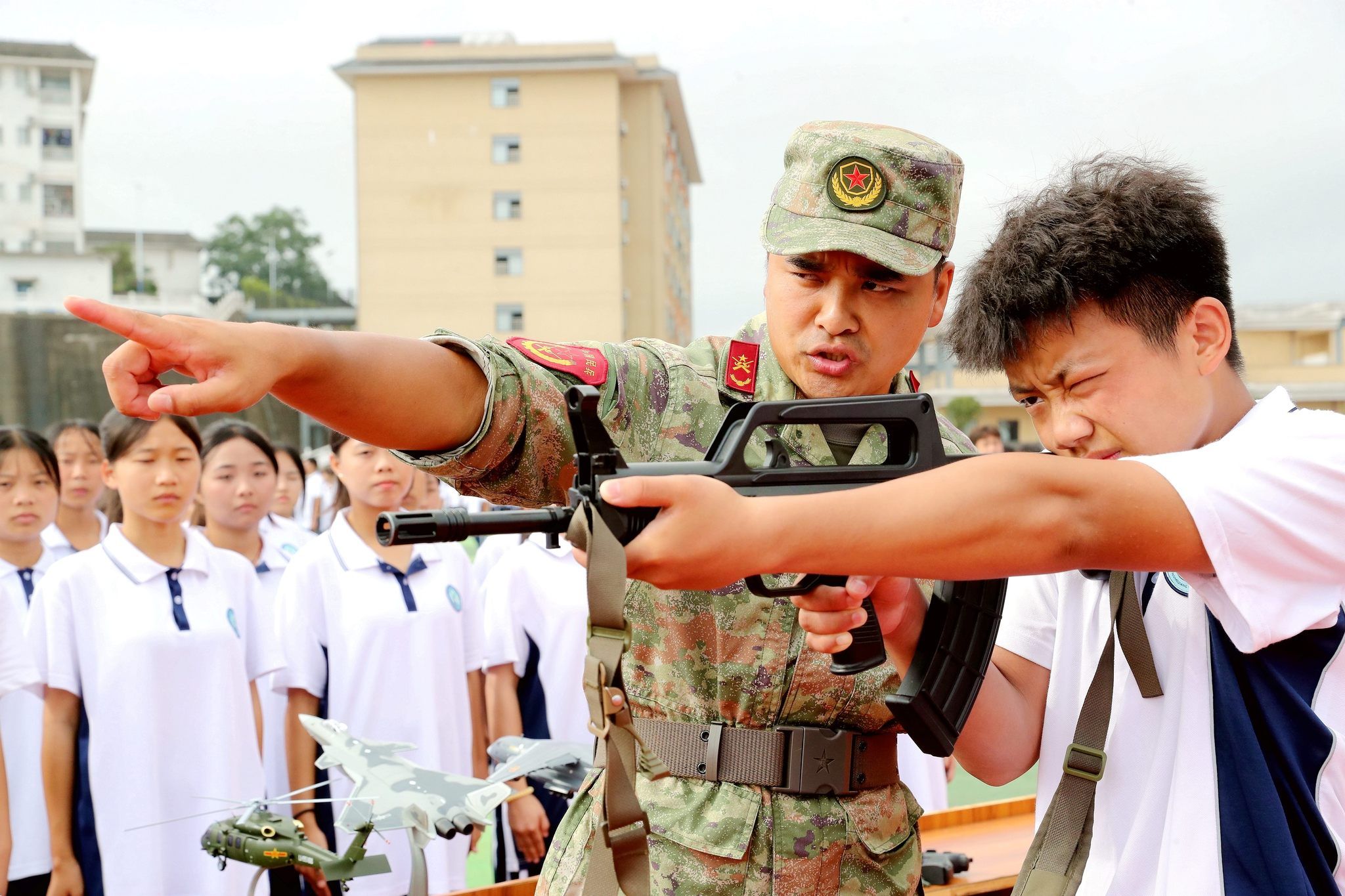 2024年9月10日,贵州黔东南州,榕江县中等职业学校,军训教官在给学生讲解枪械瞄准动作要领。