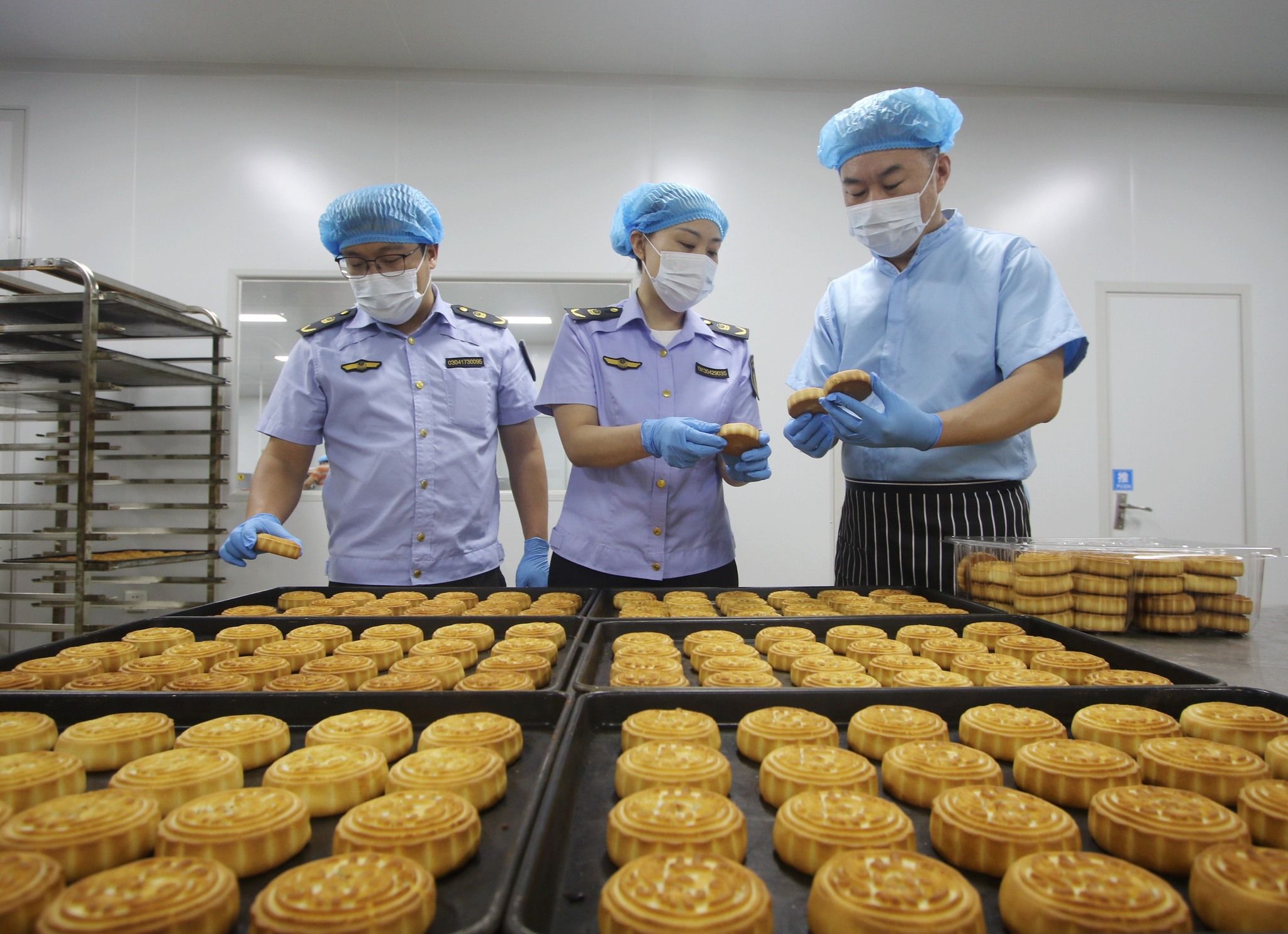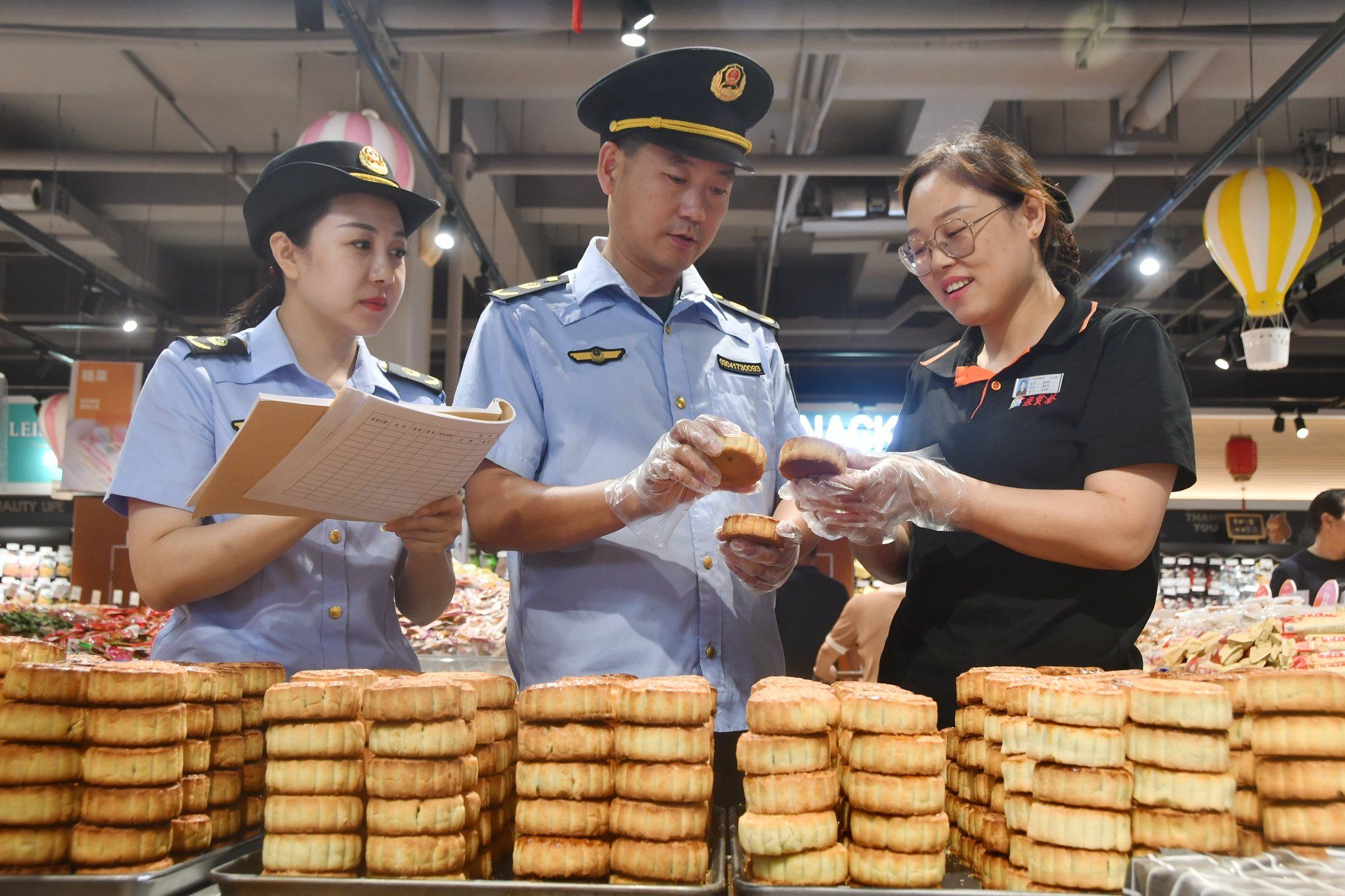 2024年9月11日,河北邯郸,永年区市场监督管理局的执法人员对一家食品企业的月饼进行检查。