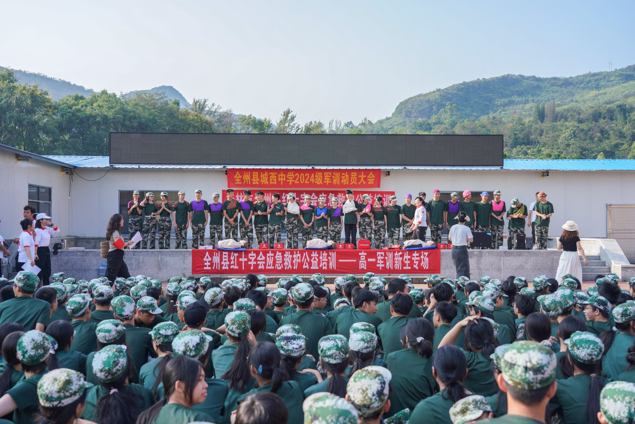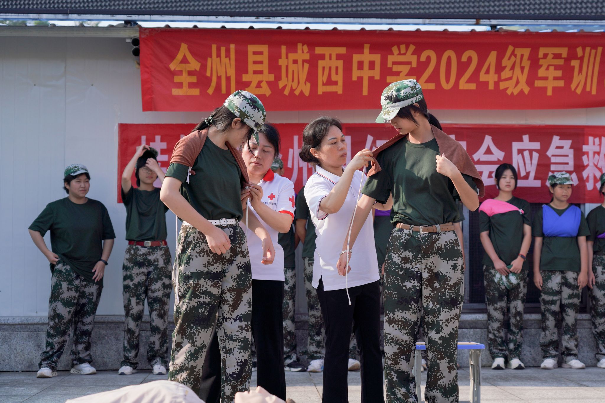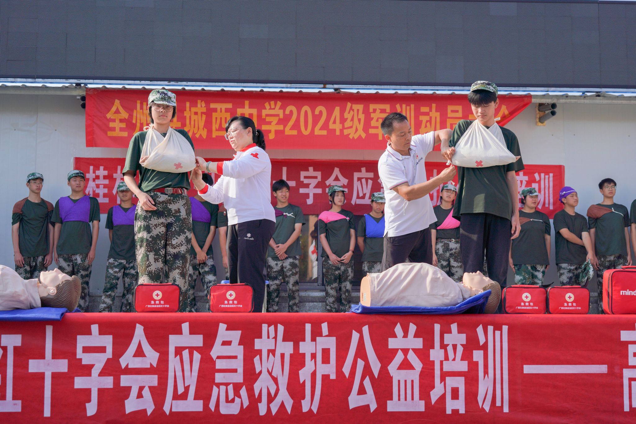 2024年9月12日上午,广西桂林,全州县红十字会志愿者老师们在城西中学为军训的一千五百余名学生进行了人工呼呼与胸部按压急救演示,头部及手臂、胸部意外伤害止血包扎应急救护现场教学。据了解,秋季新学期开学以来,全州红十字会的志愿者老师不辞辛苦,连续多场次为该县高一学生作应急救护技能公益培训,提高学生们自救互救能力。
