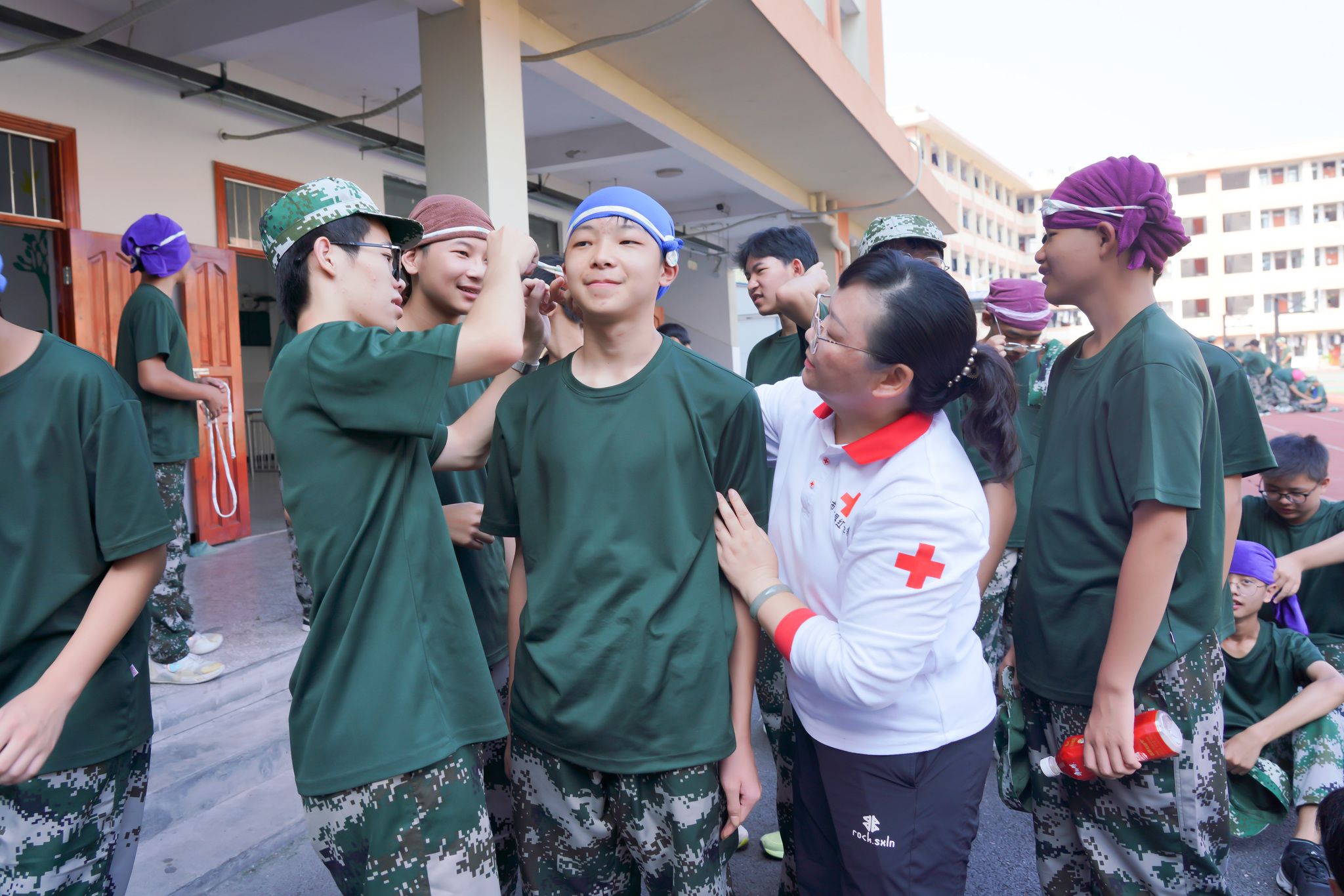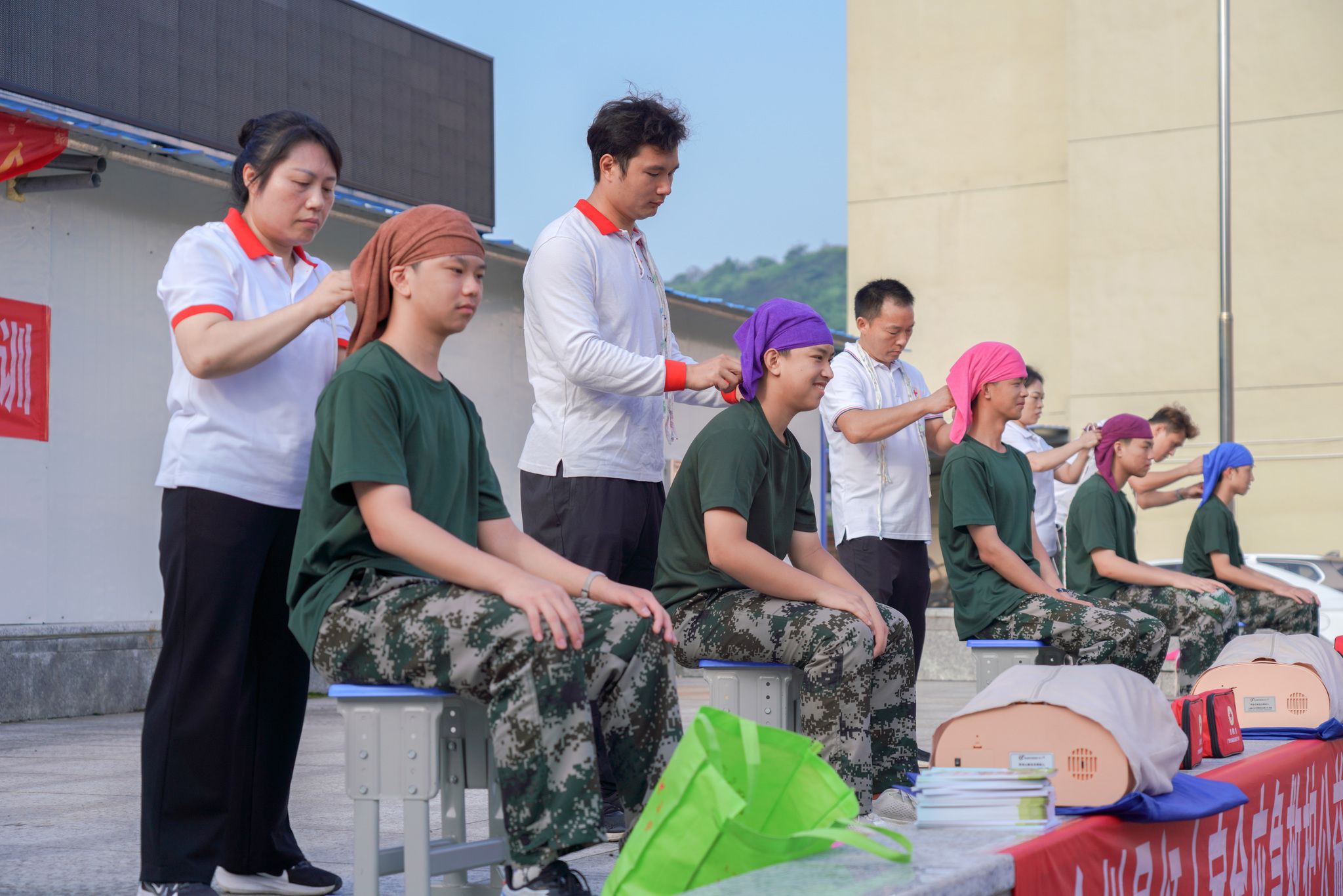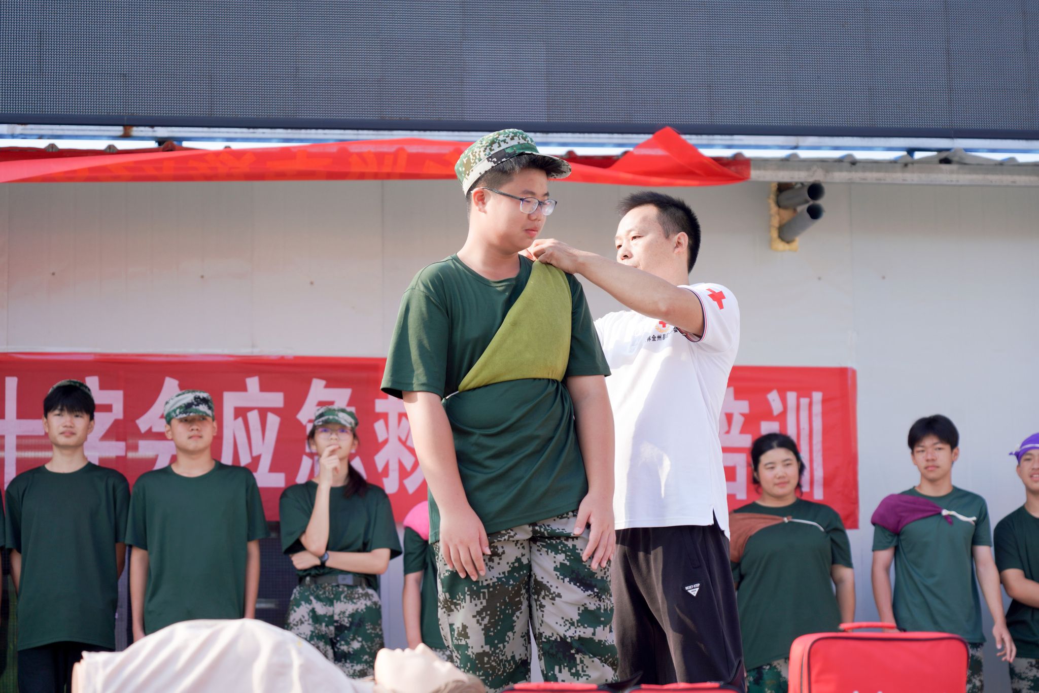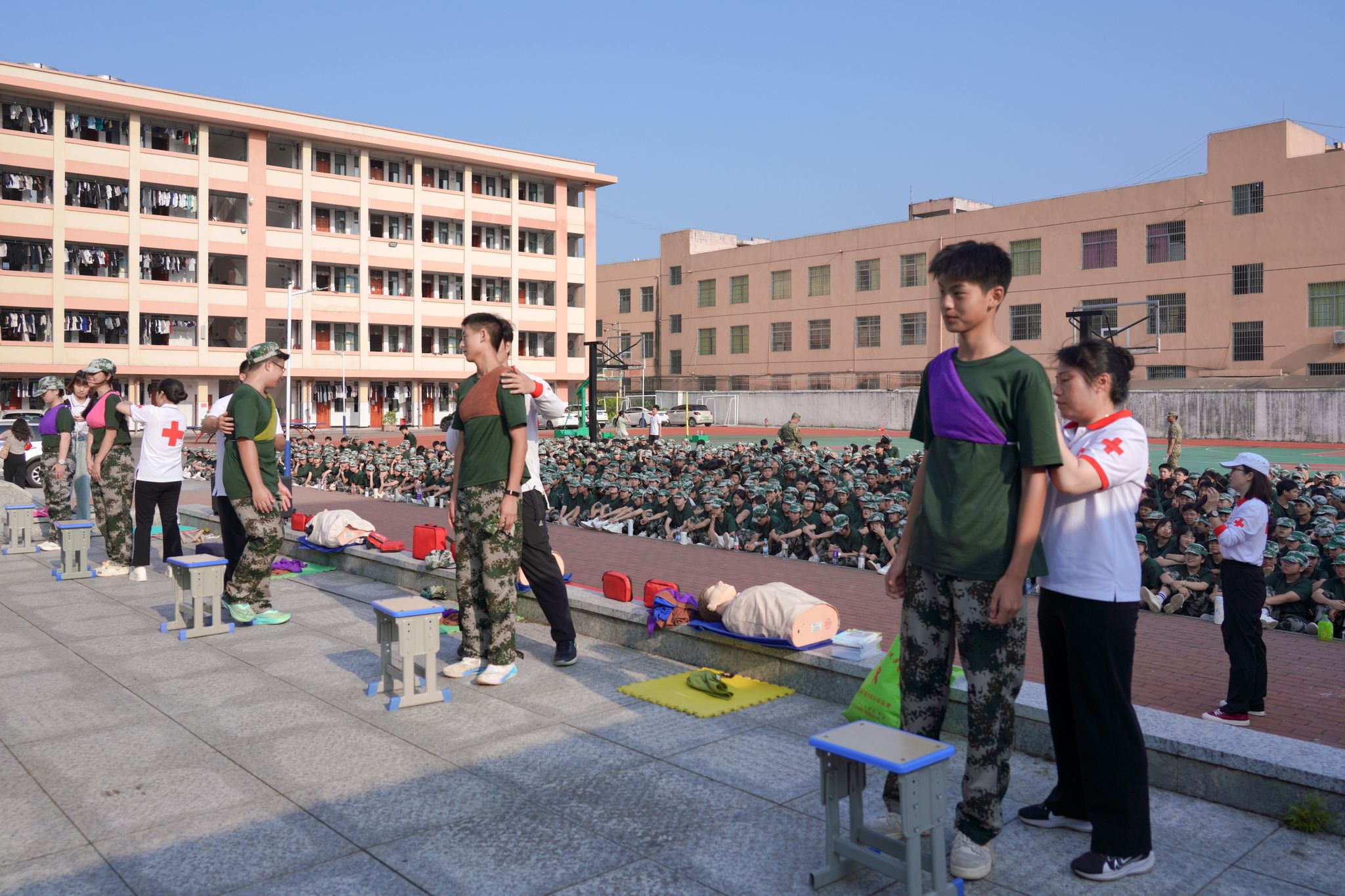 2024年9月12日上午,广西桂林,全州县红十字会志愿者老师们在城西中学为军训的一千五百余名学生进行了人工呼呼与胸部按压急救演示,头部及手臂、胸部意外伤害止血包扎应急救护现场教学。据了解,秋季新学期开学以来,全州红十字会的志愿者老师不辞辛苦,连续多场次为该县高一学生作应急救护技能公益培训,提高学生们自救互救能力。