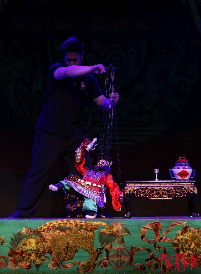 9月12日,福建泉州,泉州木偶剧院的青年演员在演绎提线木偶戏《钟馗醉酒》。中青报·中青网记者 曲俊燕/摄