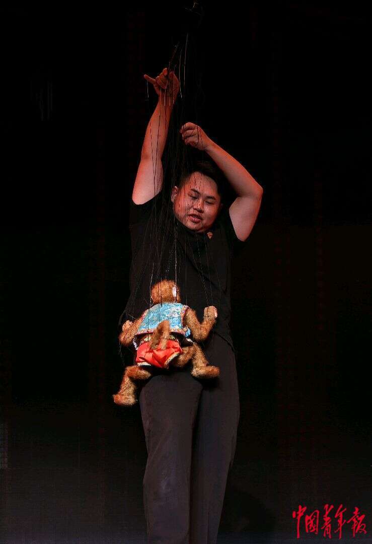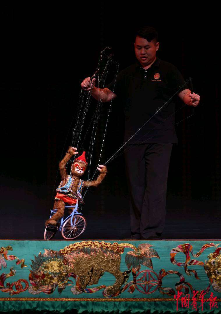 9月12日,福建泉州,泉州木偶剧院的青年演员在演绎提线木偶戏《驯猴》。中青报·中青网记者 曲俊燕/摄