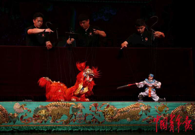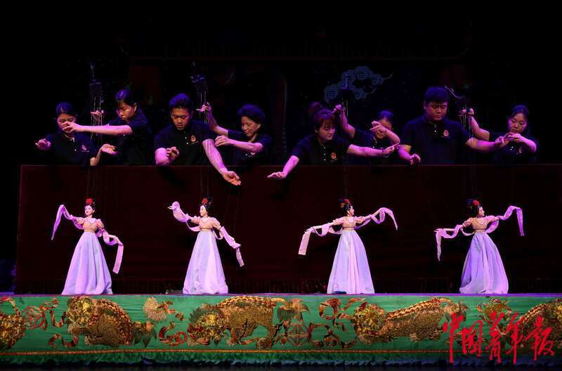 9月12日,福建泉州,泉州木偶剧院的演员们在演绎提线木偶戏《元宵乐》。该剧目吸取了“拍胸”“跳鼓”“舞狮”等民间舞蹈元素,生动再现了具有闽南民族风情的“踩街”场面,是盛演不衰的保留剧目。作为首批国家级非物质文化遗产项目之一,有一千多年不间断传承历史的泉州木偶戏近年来在社交媒体上人气高涨,据泉州市提线木偶戏传承保护中心主任洪世键介绍,截至今年8月底,泉州木偶剧院已上演600场演出,创收1600多万元,演出常常一票难求。中青报·中青网记者 曲俊燕/摄