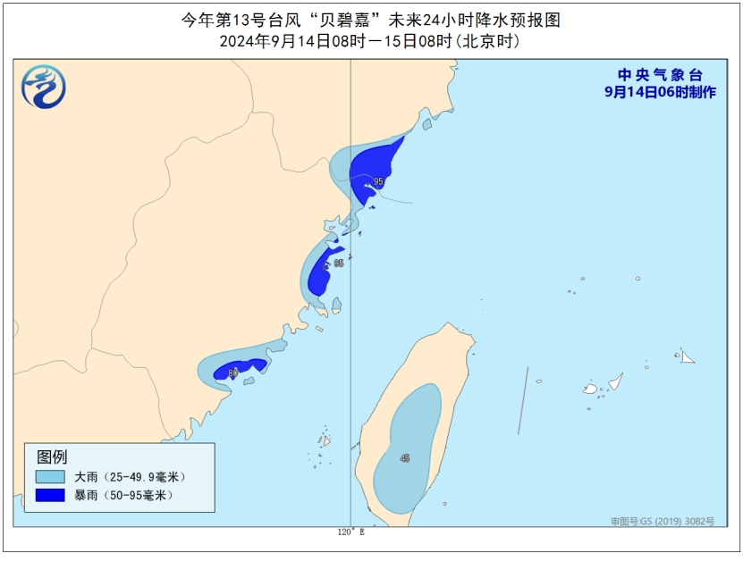 降水预报:9月14日08时至15日08时,浙江东南部、福建东部、台湾岛局地有大到暴雨(25-95毫米)。