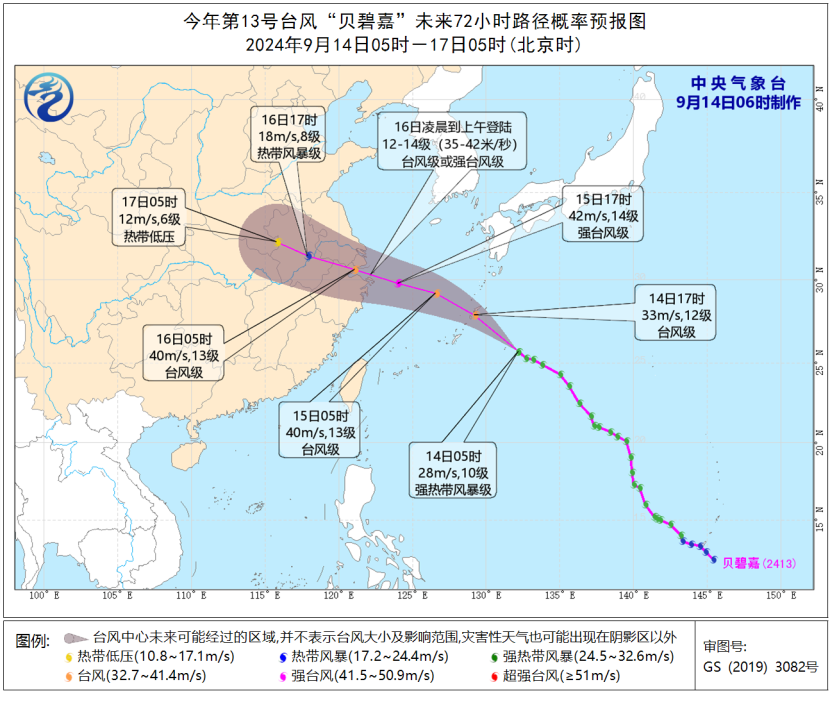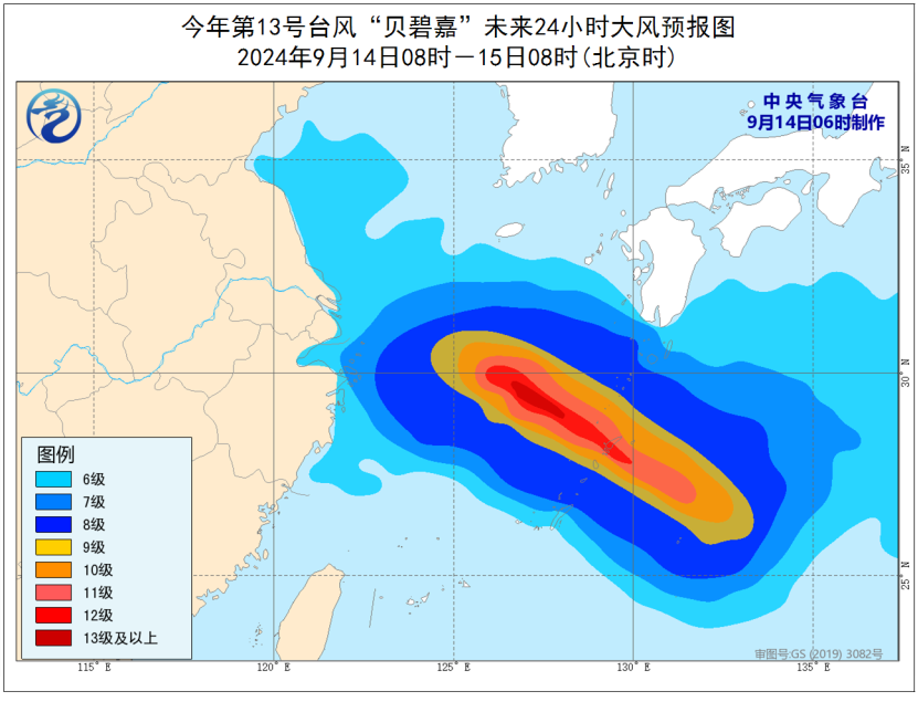 大风预报:9月14日08时至15日08时,东海大部海域、浙江东北部沿海、上海沿海将有6-8级、阵风9-10级的大风,其中东海东北部部分海域将有9-11级、阵风12-13级的大风,“贝碧嘉”中心经过的附近海域或地区风力可达12-13级、阵风14级。
