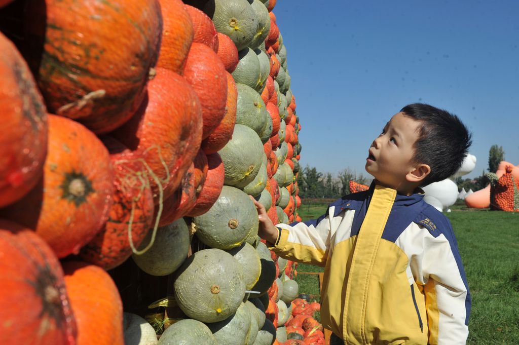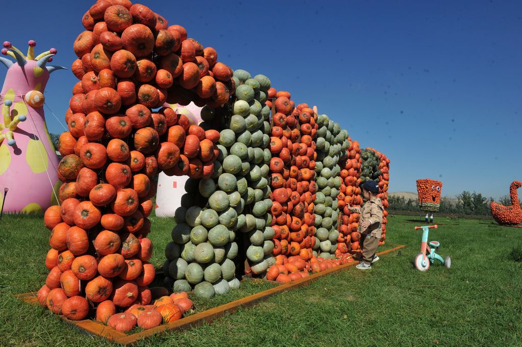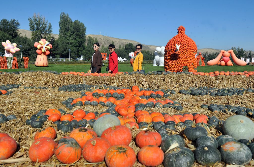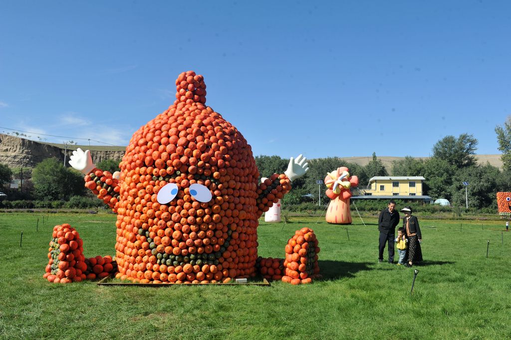 2024年9月15日,乌鲁木齐,游客在南瓜艺术展上参观。