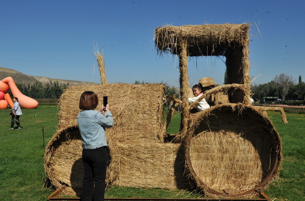 2024年9月15日,乌鲁木齐,游客在稻草制成的模具上打卡拍照。