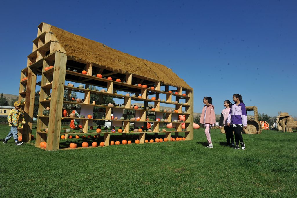 2024年9月15日,乌鲁木齐,游客在南瓜屋里参观。