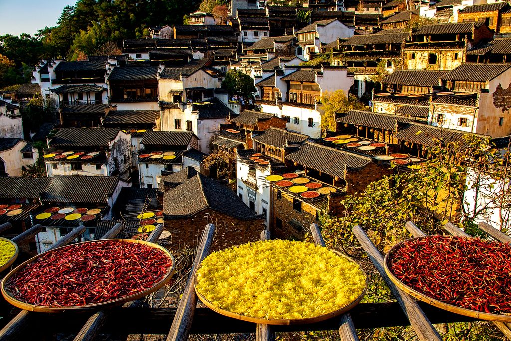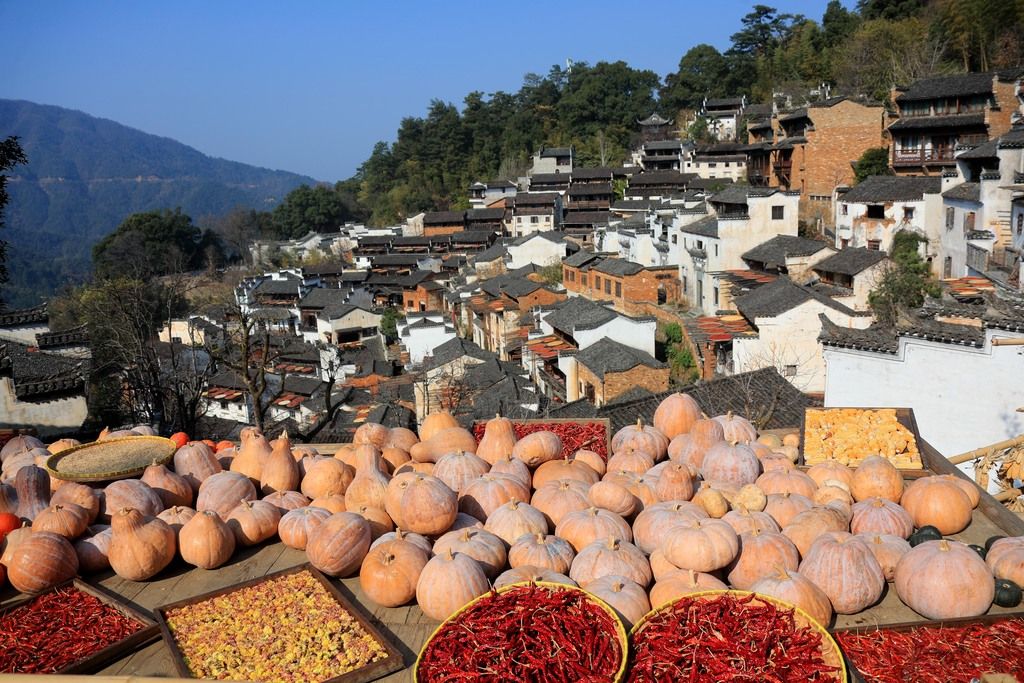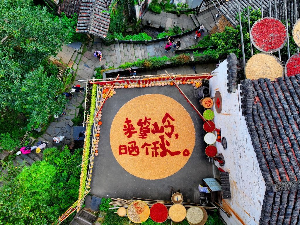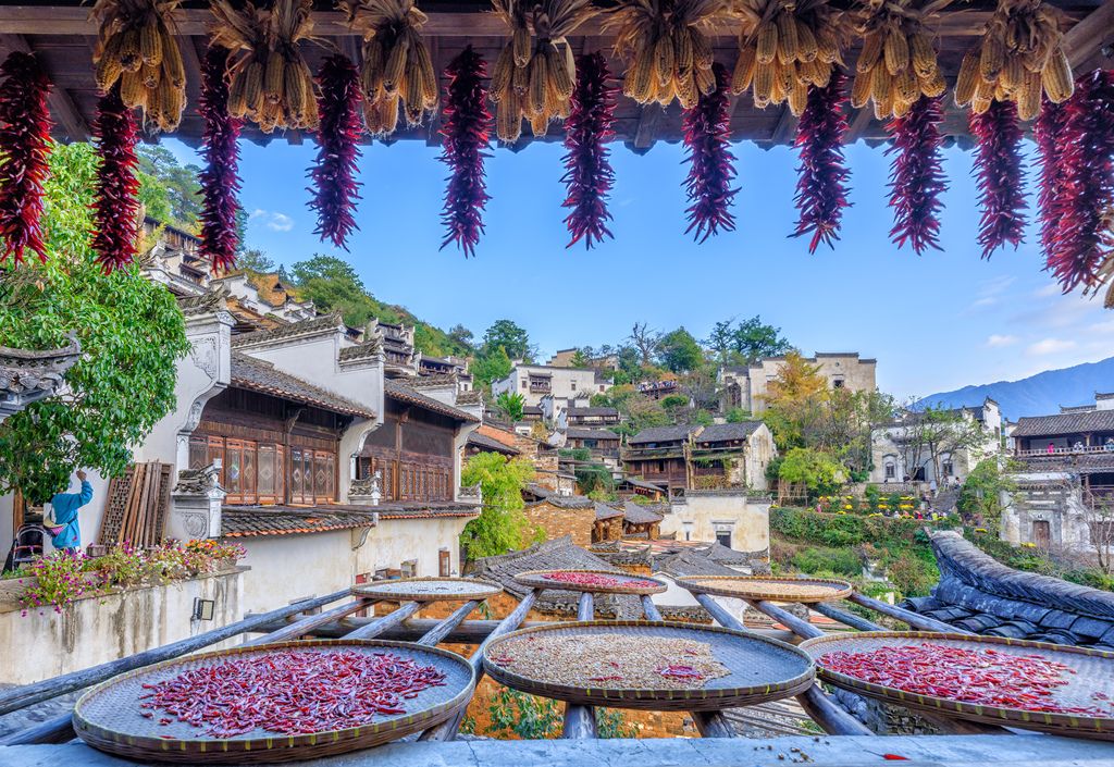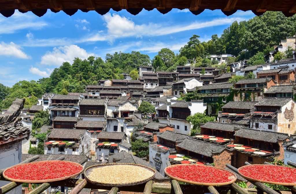 2023年8月10日,江西上饶,婺源县篁岭村,木晒架上的一个个竹簸盛满红辣椒、玉米、南瓜等农作物,与徽派民居、连绵青山共同勾勒出一幅独特的丰收画卷。