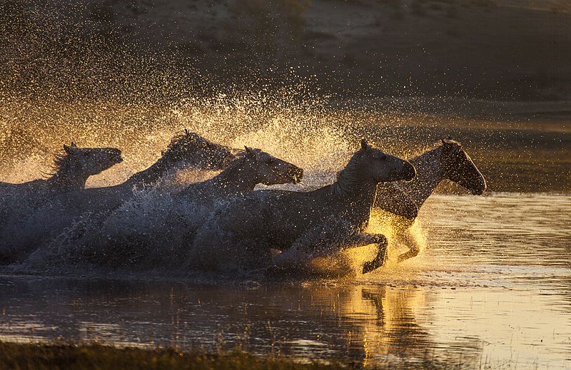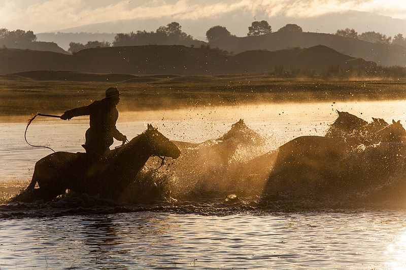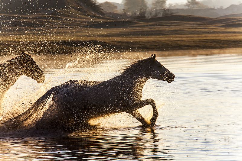 2024年9月22日清晨,内蒙古自治区赤峰市,克什克腾旗西南部的乌兰布统景区,水上奔马吸引游客。