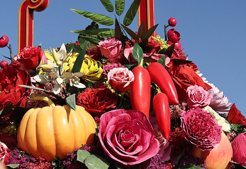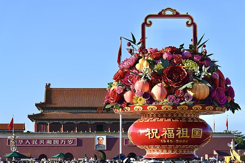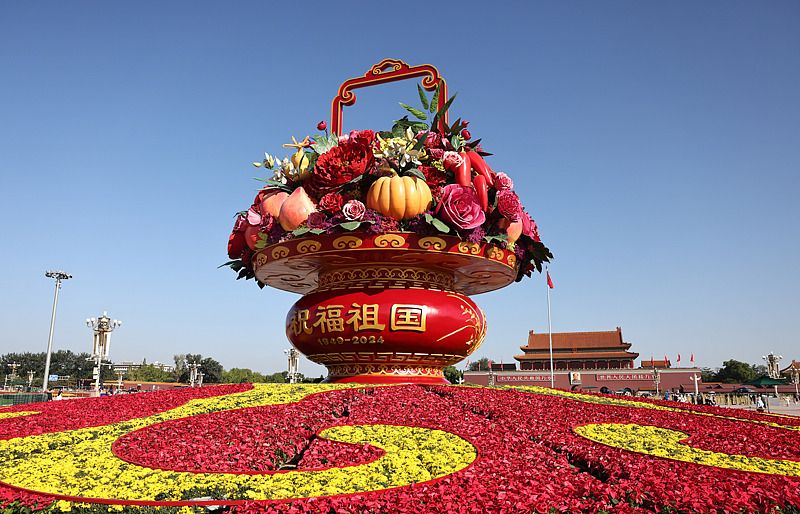 2024年9月22日,北京天安门广场中心,国庆主题花坛“祝福祖国”蔬果花篮主体结构亮相,吸引众多市民游客抢先打卡、拍照留影。