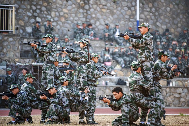 2024年9月22日,安徽省淮北市相山区,淮北师范大学大一新生在操场上进行队列、擒敌拳、战地勘察、战地救护等军事科目的训练。