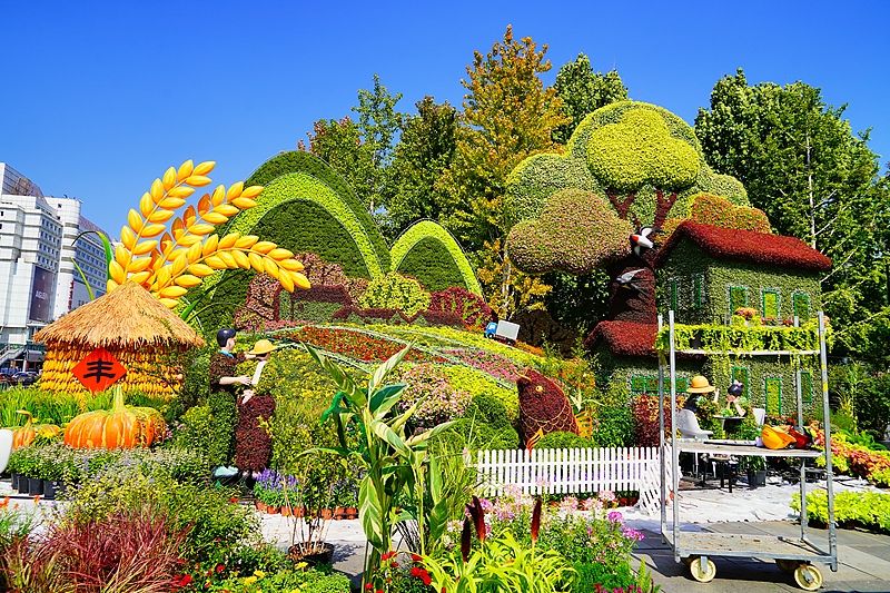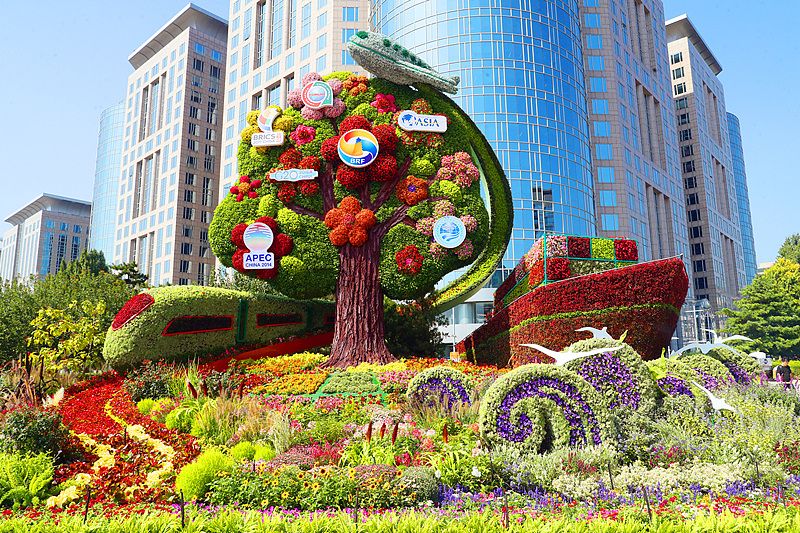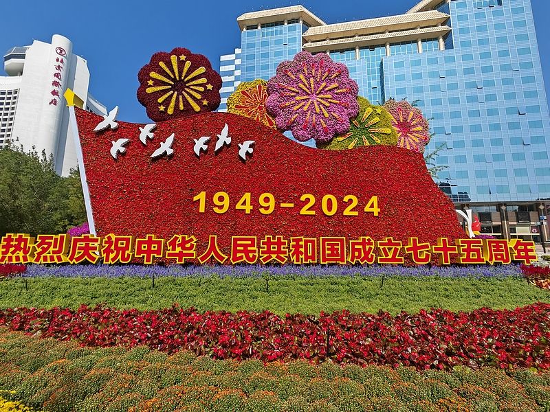 2024年9月23日,北京西单路口的花坛正在搭建中,工人对花卉摆放位置做调整。为了迎接国庆节的到来,北京长安街沿线各主题花坛正在有序搭建。