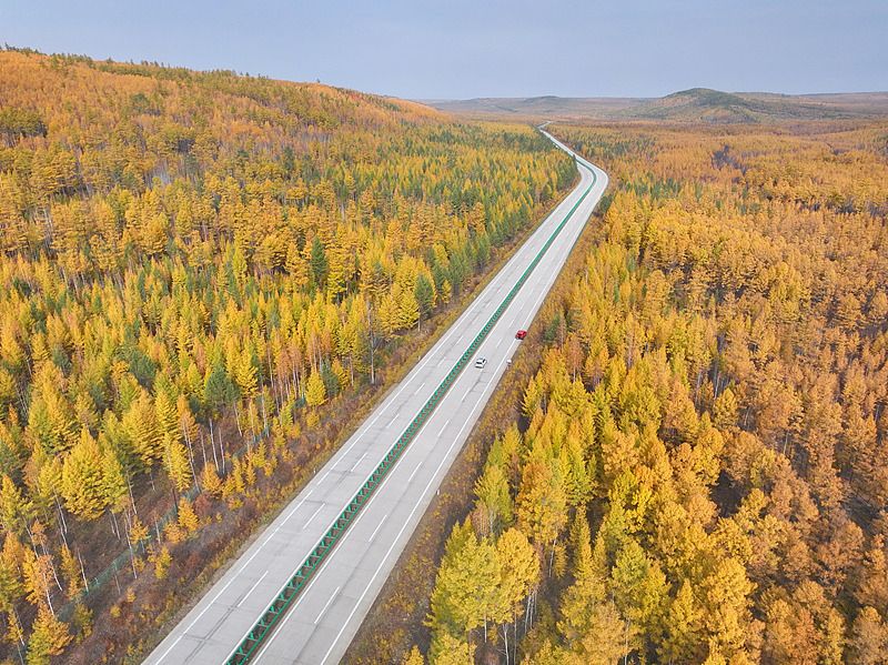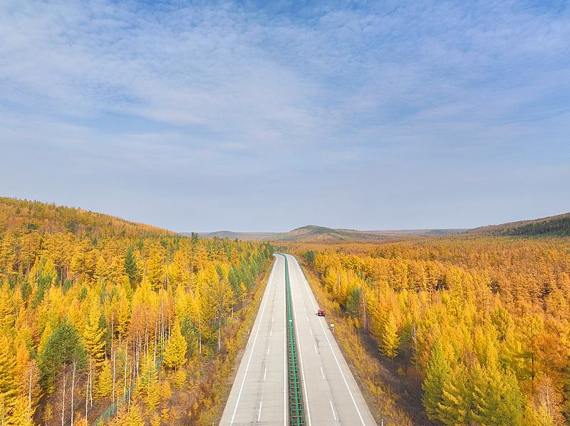 漠北高速公路是世界上第一条在高纬度高寒地区修建的高速路,也是中国最北的高速公路,全长81.76公里。眼下,这条迎来最美季,公路两侧松树、白桦等树木漫山遍野黄绿相间,成为一道美丽的风景。