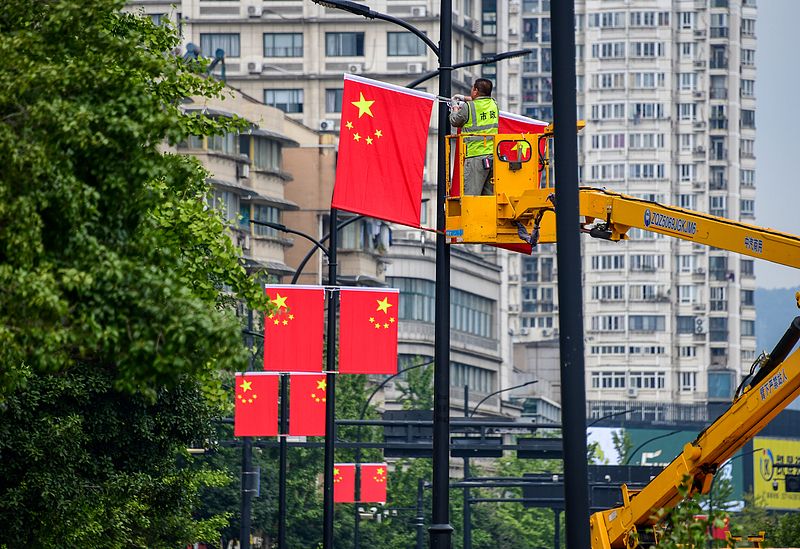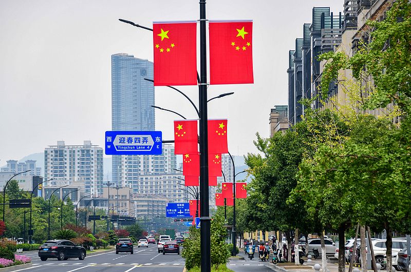 2024年9月24日,浙江桐庐县城主要路段悬挂起五星红旗,喜迎国庆节。