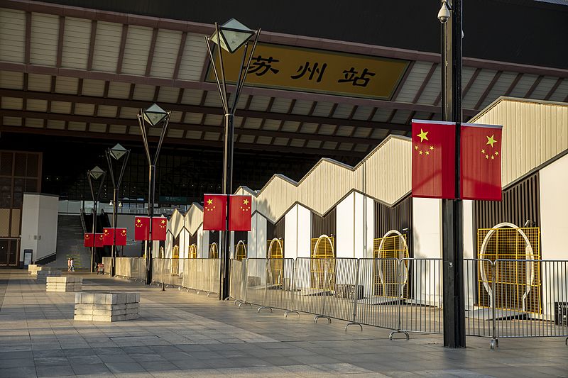 2024年9月23日,江苏苏州,为迎接国庆节十一假期,苏州火车站站前广场悬挂起鲜艳的五星红旗,营造节日气氛,迎八方游客。