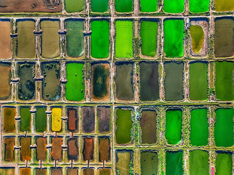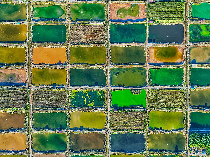 2024年9月21日,内蒙古呼和浩特,从空中俯瞰,方方正正的成片鱼塘水光潋滟,宛若大地调色盘。 呼和浩特市土左旗哈素海万亩生态渔场是当地重要的渔业资源,提供大规模的鱼蟹养殖。这里出产的大闸蟹以其独特的品质在市场上很受消费者欢迎。渔场为当地经济的多种发展和生态环境的利用与保护做出了贡献。