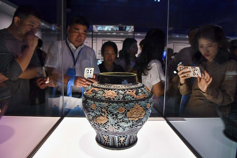 2024年9月27日,海南琼海,展出的明代《珐华贴金镂空孔雀牡丹纹大罐》吸引参观者。当日,“深蓝宝藏——南海西北陆坡一二号沉船考古成果特展”在中国(海南)南海博物馆开展。本次展览是南海海域深海考古调查的成果专题展。在深海1500多米处沉睡了500多年的出水文物首次公开亮相。展览展出上述两处明代中期沉船遗址出水的文物408件(套),还有故宫博物院等借展文物34件/套,共计展出442件(套)。