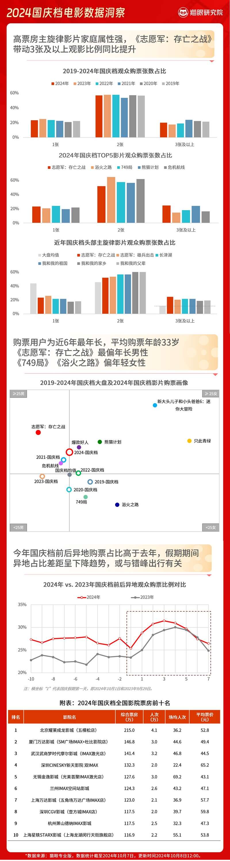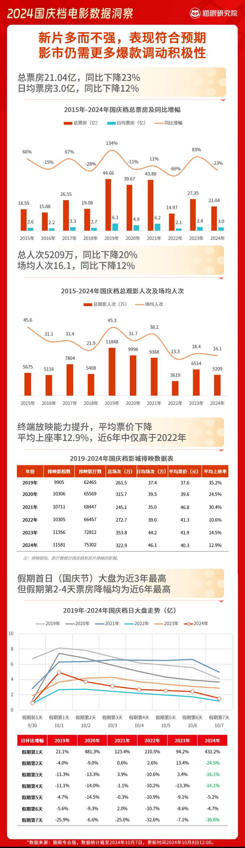10月8日,猫眼研究院发布的《2024国庆档电影数据洞察报告》显示,2024年国庆档总票房为21.04亿元,日均票房3亿元,总观影人次为5209万。