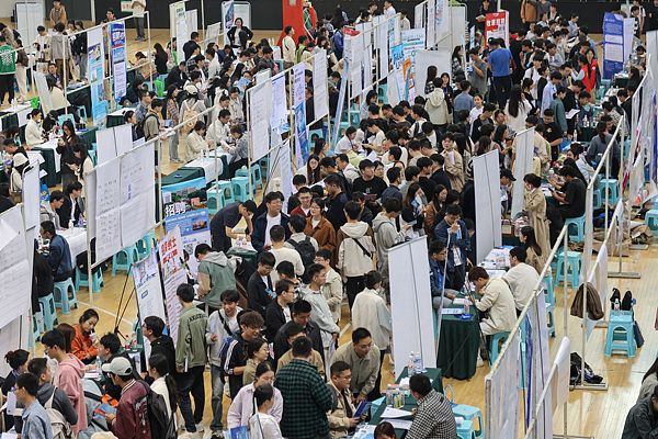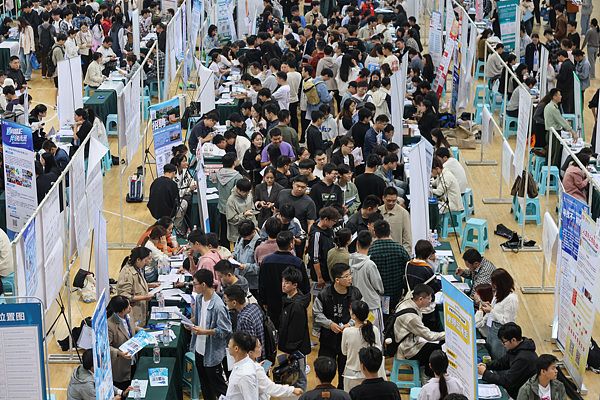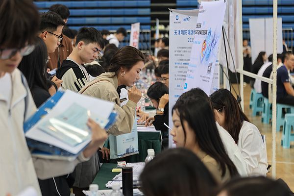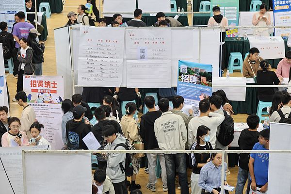 2024年10月11日,郑州,一场大型秋季校园招聘会在郑州大学体育馆举办,此次毕业生与企业的双选会锚定“秋招+校招”两个标签,吸引大批大学生携带简历,寻找合适的工作机会。