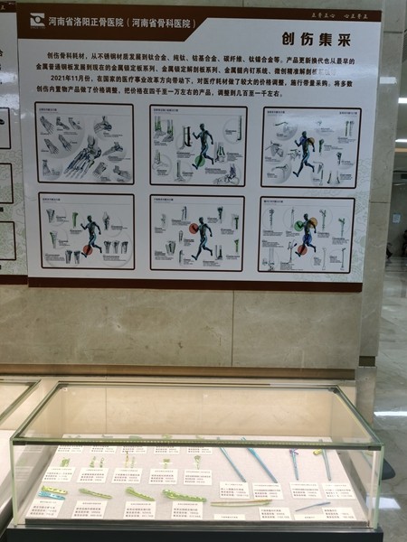 在河南省洛阳正骨医院(河南省骨科医院)郑州院区门诊楼一层的显眼位置,两排展柜里摆放着骨科手术的耗材,旁边还注明了集采前后价格的对比。在这家河南省骨科诊疗量最大的医院里,每天来来往往的患者及家属都可以参观了解我国高值医用耗材(高值医用耗材,一般指至关重要、生产使用必须严格控制、限于某些专科使用且价格相对较高的消耗性医疗器械——记者注)集采工作的成果,还可以仔细算一下,集采让自己省了多少钱。